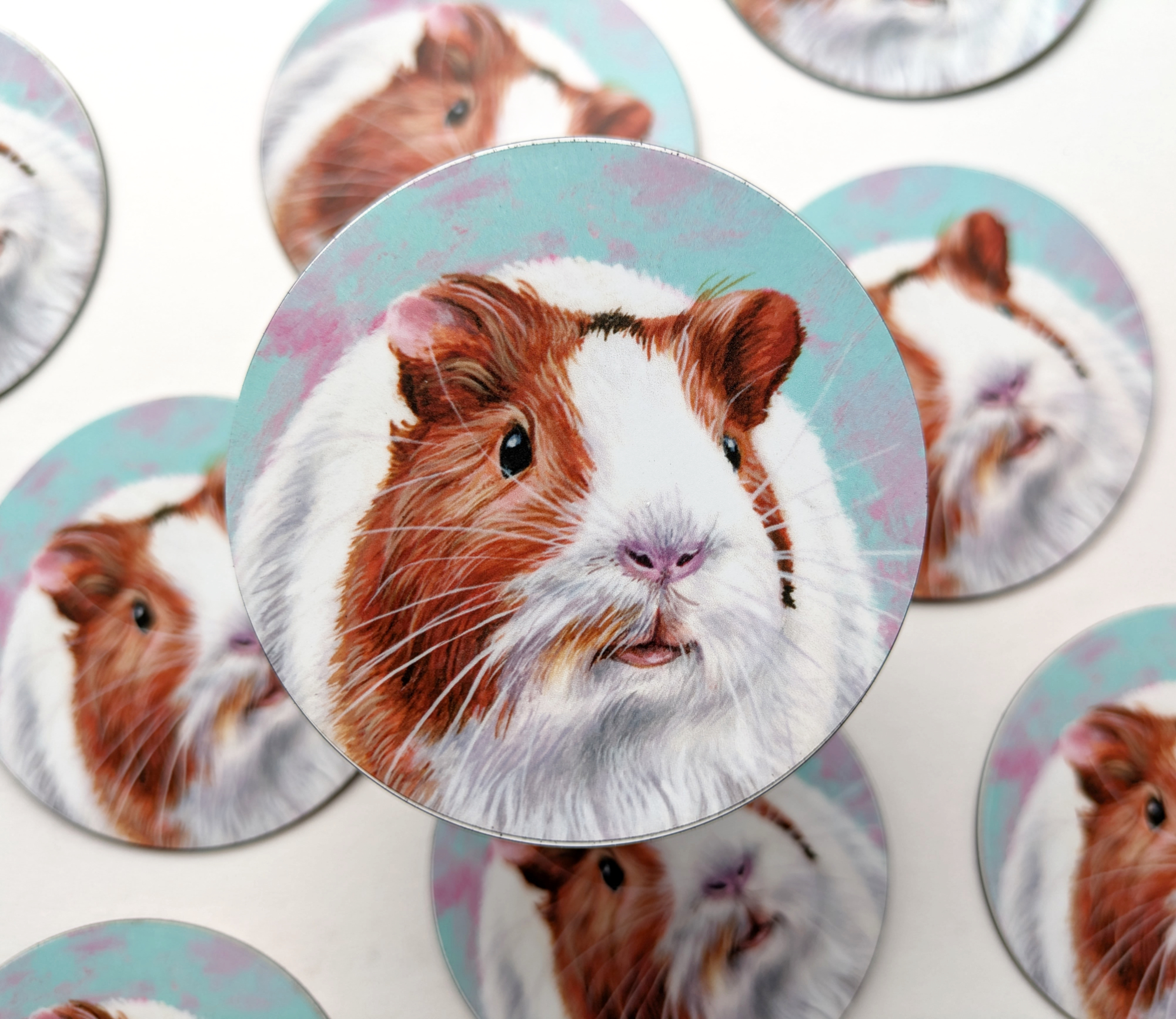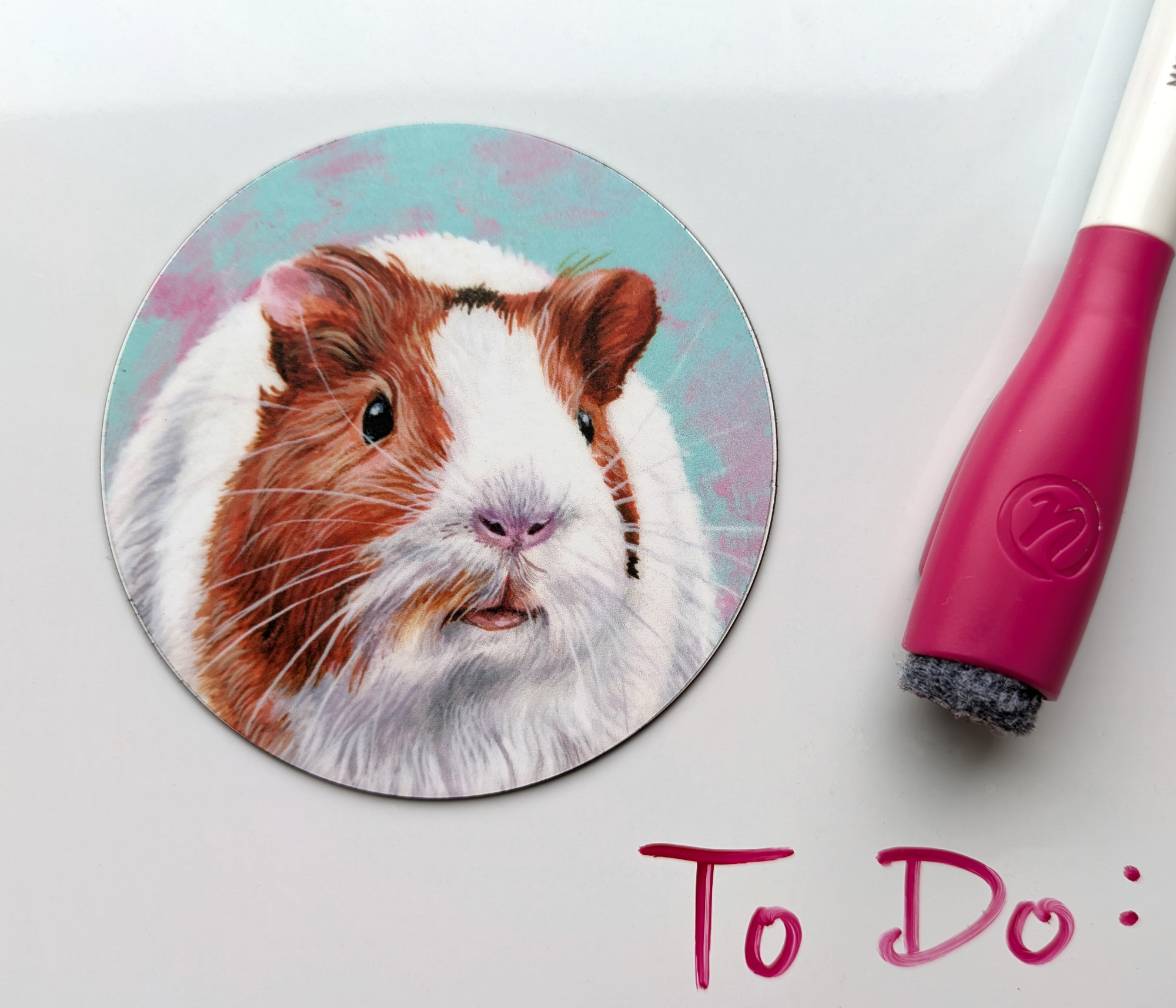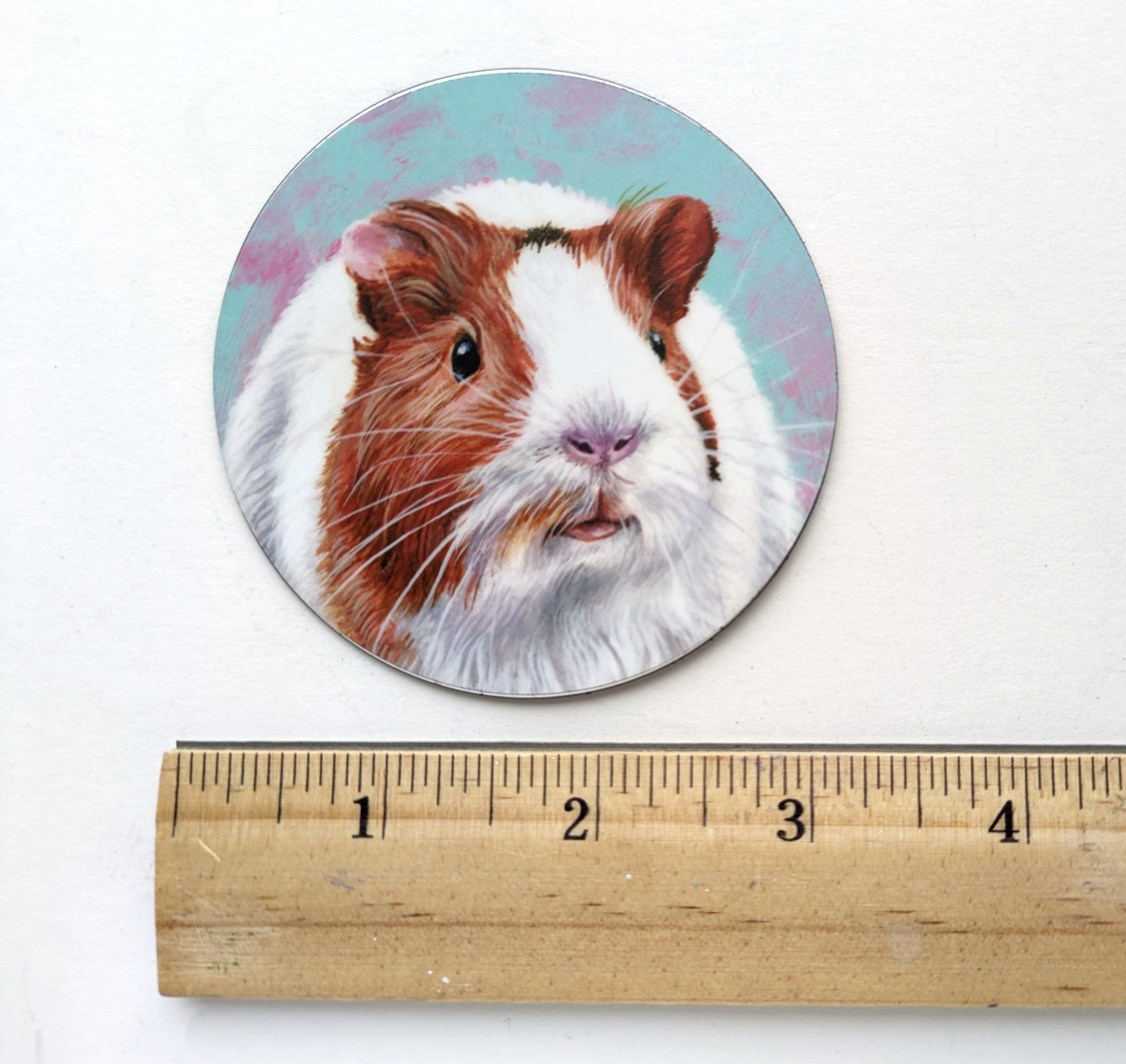 A 3 x 3 inch guinea pig magnet . This design was made from a painting I created in 2024.