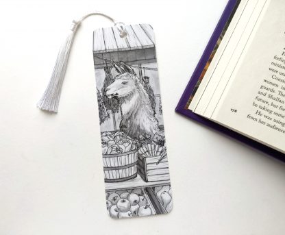 This bookmark shows a black and white illustration of a llama making mischief behind a market stall.